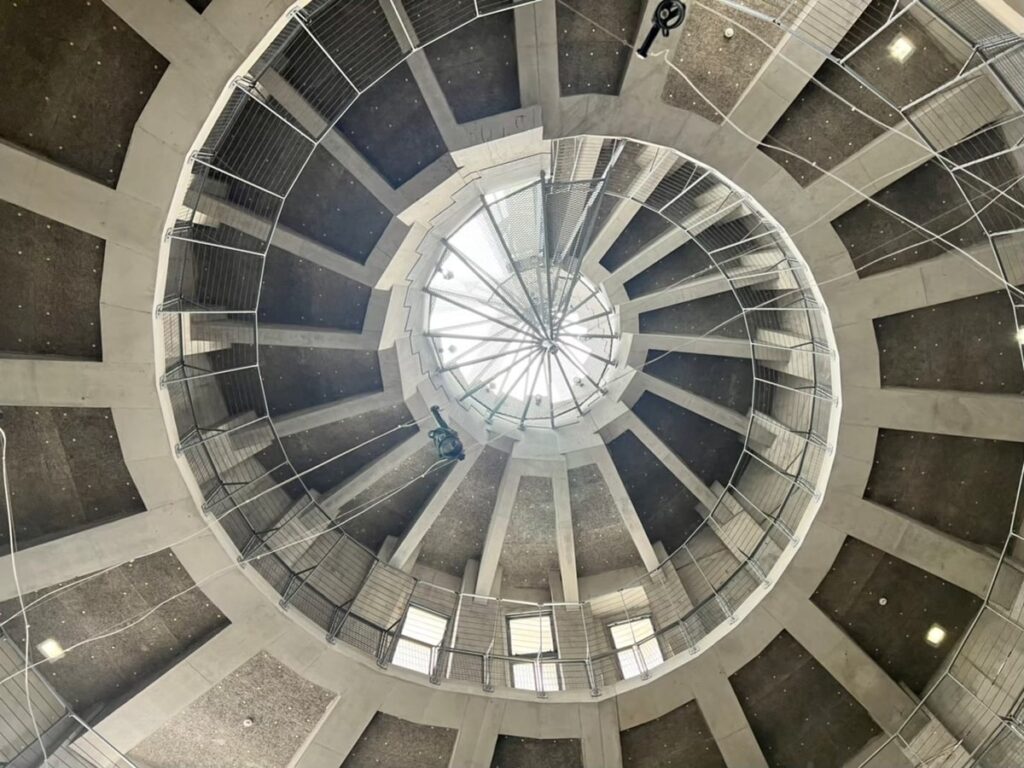 巻き貝みたいな塔が、ぐるぐるとスロープで上へ続く不思議な形なんです🌀